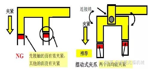 當一個夾緊器夾緊2個以上部位時,為了將多個面都能有效夾緊,需要將夾緊器設計為擺動式或可調節試(建議擺動式)。